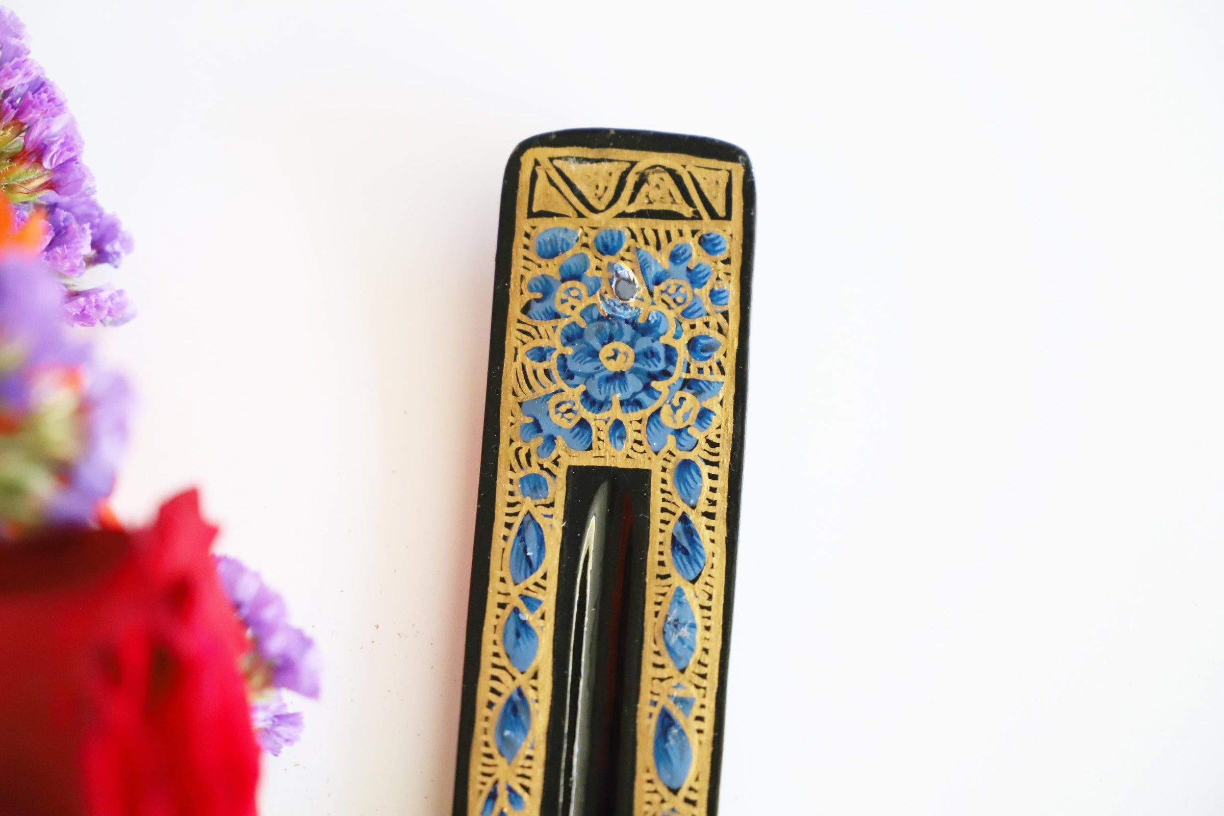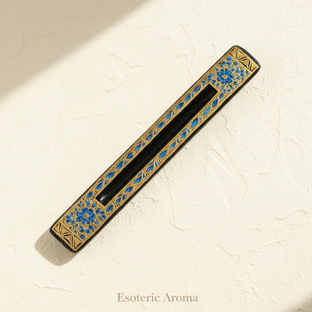 This black and blue floral incense holder combines bold contrast with ornate gold detailing. Measuring approximately 10 inches long, it features intricate decorative artwork against a deep black base.