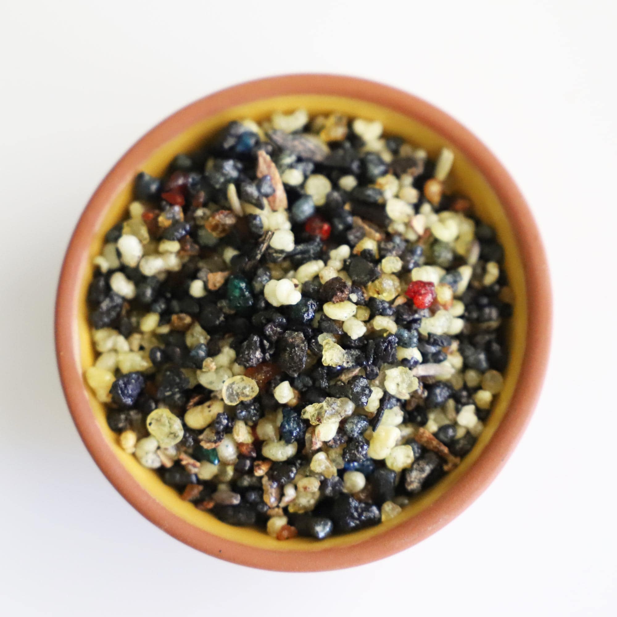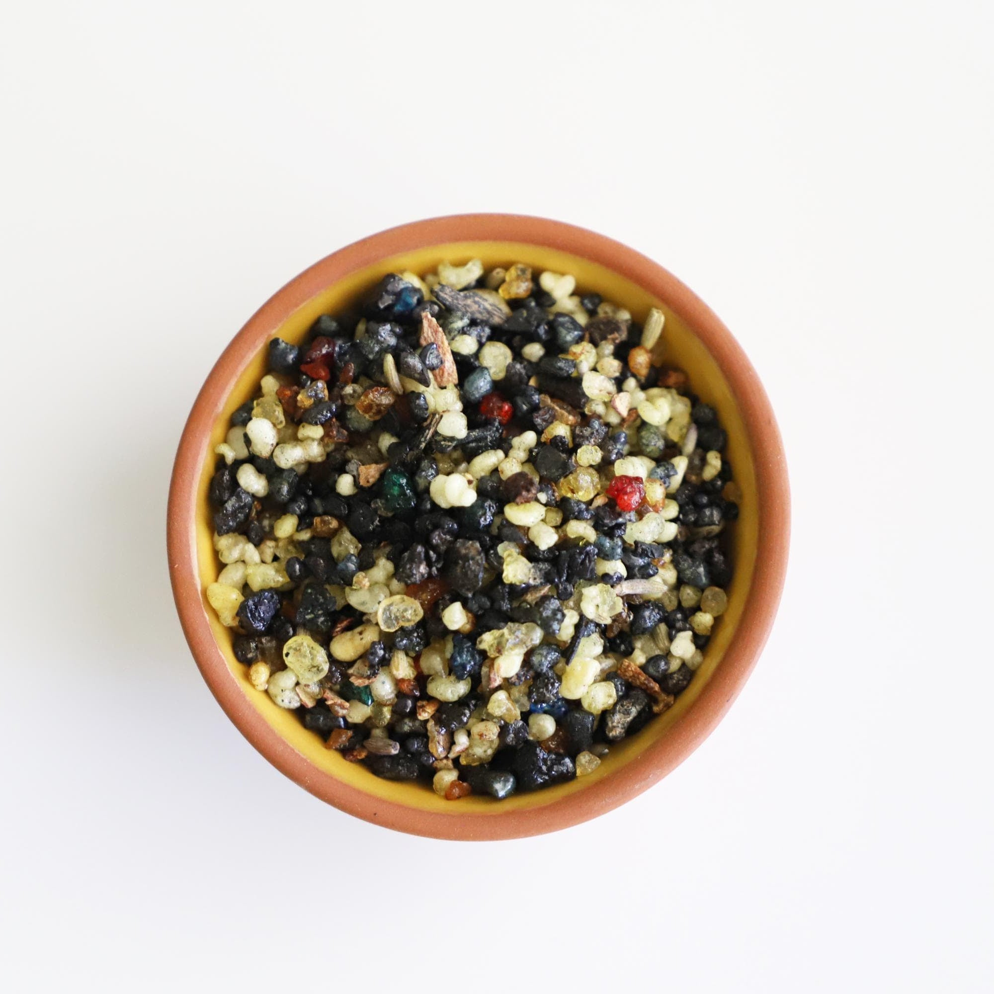 This incense features a mixture of colorful glazed gum granules in shades of yellow, red, green, blue, and clear, combined with delicate lavender blossoms. As the resin warms, the blend releases a layered fragrance that is earthy, slightly sweet, and softly herbal.