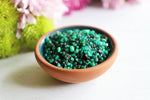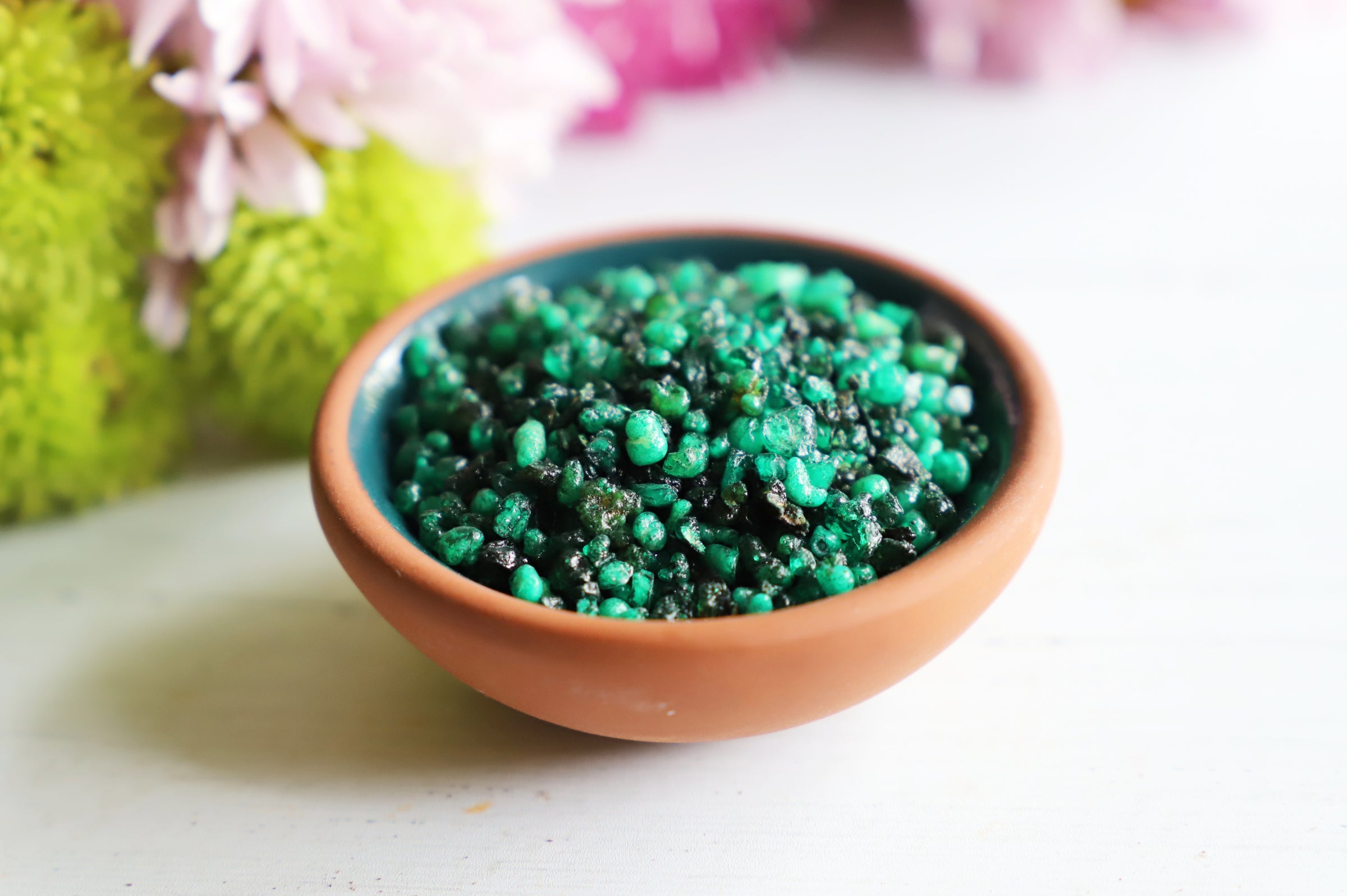 Small bowl of pink resin grains on a white surface with pink flowers in the background
