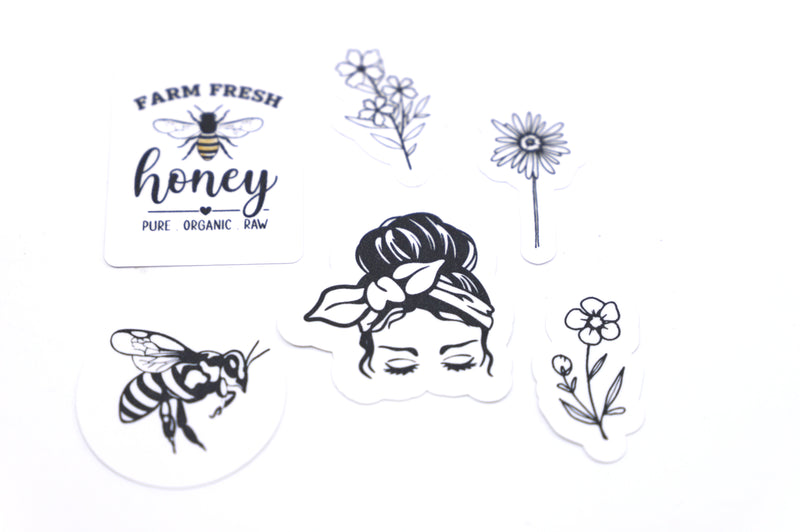 Our Farm Fresh Honey sticker pack includes a Farm Fresh Honey sign, farm girl, bee and 3 different flowers. Use to decorate your garden notebook, journal, laptop, cards and more.
